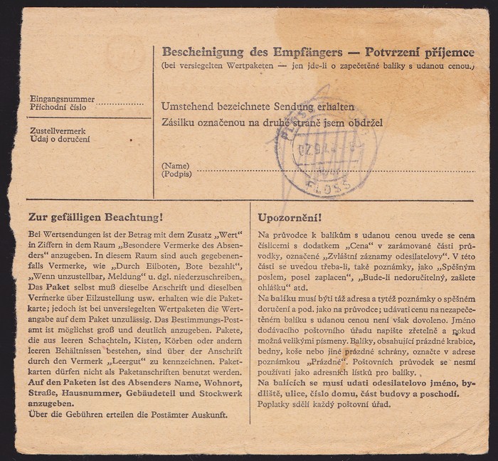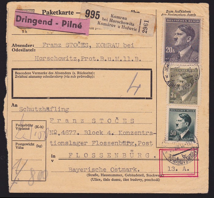 Concentration Camp: 1944 inwards packet card franked Bohemia & Moravia Hitler 50c, 3K & 20K, tied by 'Komarov 28 VIII 44' cds & with Flossenburg arrival b/s. Rare usage. (P)