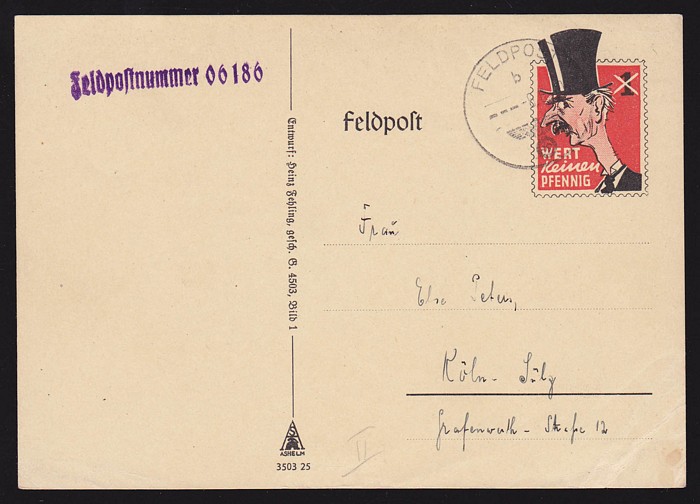 5494 image1940-42 Churchill 'not worth a pfennig' German Nazi propaganda Feldpost card type C with Feldpost in fancy 'Rotunda' font, black 'Ashelm 3503 25' imprint. Genuine postally U with unit cachet & blank fieldpost '3 7 41' cds. (P) (Image1) (Image2)