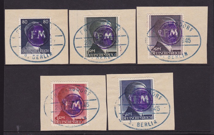 5498 imageFredersdorf: 1945 'F.M' violet h/s opts Hitler set 1pf-5Mk, 1Mk & 2Mk perf 14 & 3Mk & 5Mk perf 12½. VFU, all on piece with 'Fredersdorf 20 JUL 1945 Berlin' cds in blue Mi 1-19, 20B, 21B, 22A, 23A cat €530+. (23). (P) (Image1) (Image2) (Image3) (Image4)