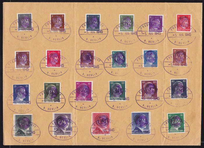 5499 imageFredersdorf: 1945 'F.M' violet h/s opts Hitler set 1pf-5Mk, the 2Mk-5Mk perf 12½. VFU oval 'Fredersdorf 3 AUG 1945 Berlin' pmks on envelope Mi 1-23 cat €530+ as loose stamps. (23). (P) (Image1)