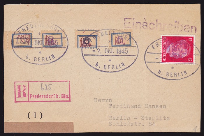 5500 imageFredersdorf: 1945 'F.M' violet h/s opt Hitler 12pf red, error h/s SIDEWAYS!, plus Numeral Provisionals, 14 x 9½mm double-lined blue frame 5pf & 8pf violet numeral & 6pf & XII Pfr blue-black numerals, all large numeral with red signature, all tied by 'Fredersdorf 2 OCT 1945 Berlin' oval pmks to registered cover front. VF. Mi 8(var), Sp101b, Sp103b, Sp105b & Sp107b cat €83++ as loose stamps & €160++ on cover, plus premium for the sideways opt error. Exp Richter. (Image1)