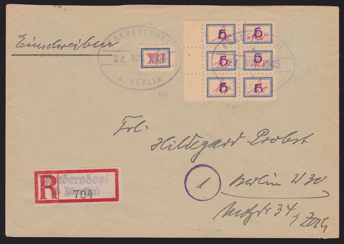 5504 imageFredersdorf: 1945 Numeral Provisionals format 14x9½mm, double-lined blue frame 5pf left marginal blk of 6 & XII pf, large numerals (XII Pfr in red), signed in red or black, tied by 'Fredersdorf 24 NOV 1945 Berlin' oval pmks to registered cover. Mi Sp101b & Sp109b cat €120 as loose U stamps & €210 on cover.Only 2000 printed & rare on correctly franked cover. Exp Harder BPP. (P) (Image1) (Image2)