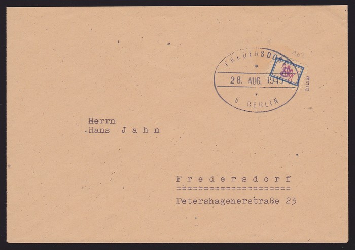 5505 imageFredersdorf: 1945 Numeral Provisionals, format 14x9½mm, double-lined blue frame 8pf, large numeral with red signature, tied by 'Fredersdorf 28 AUG 1945 Berlin' oval pmk to cover. Mi Sp103b. Only 3000 printed & scarce proper usage. Exp Dr Dub. (Image1)