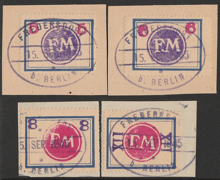 5506 imageFredersdorf: 1945 Numeral Provisionals, 31x23mm double-lined blue frame, h/s FM in violet or red, set 5pf, 6pf, 8pf & XIIpf. Superb U, all on piece with 'Fredersdorf 15 Sep 1945 Berlin' oval pmks. Mi Sp153-Sp156 cat €400++ Only 150 sets printed. Exp Dr Heber & Zierer BPP, plus 2019 Ceremuga photo cert. (P) (Image1)
