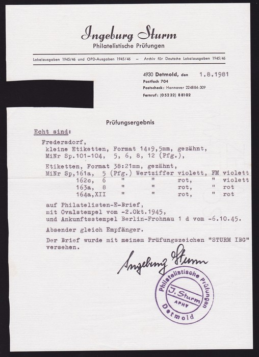 5507 imageFredersdorf: 1945 Numeral Provisionals, 14x9½mm double-lined blue frame set 5pf-XIIpf, large violet numerals with red signature, plus large format 38x21mm double-lined blue frame set 5pf-XIIpf as 2 se-tenant horiz prs, all 4 with error colours(!) perf, tied by 'Fredersdorf 20 OKT 1945 Berlin' oval pmks to registered cover (sl aging), 'Berlin- Frohanau 6.10.45' b/s & official Fredersdorf pictorial cachet. Mi Sp161FI, 162FIII, 163FI, 164FI & SP101b- 104b cat €1180 as loose singles & unpriced on cover. Extremely rare, only 250 sets printed, & only several such se-tenant colour error prs recorded! Sturm cert. (P) (Image1) (Image2) (Image3)