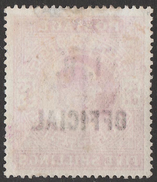 opt KEVII 5/- bright carmine. Fresh M, original gum, expertly repaired tear at top, excellent centring & beautiful bright colour. Scott O24 cat US$42,500. SG O25 cat £38,000 = A75,000. Genuine mint examples are of great rarity as only tiny