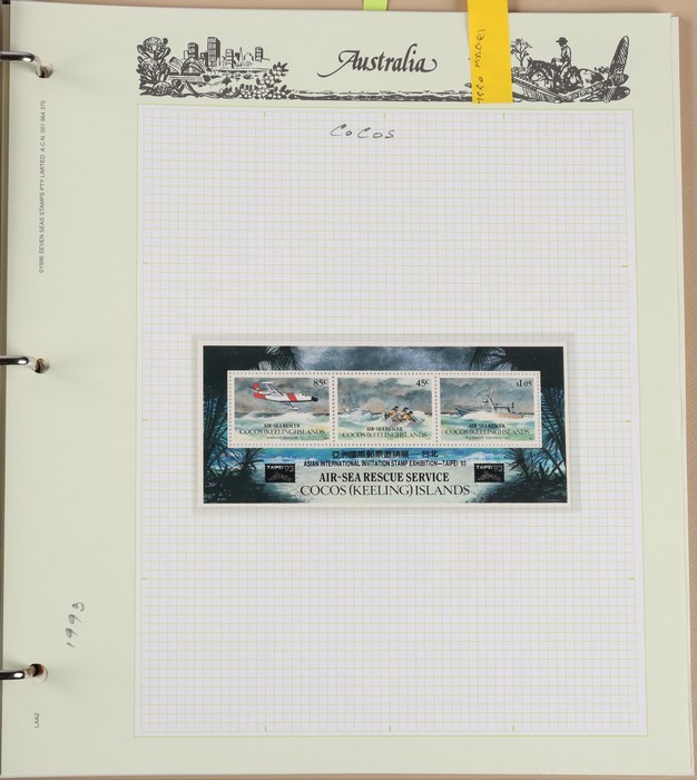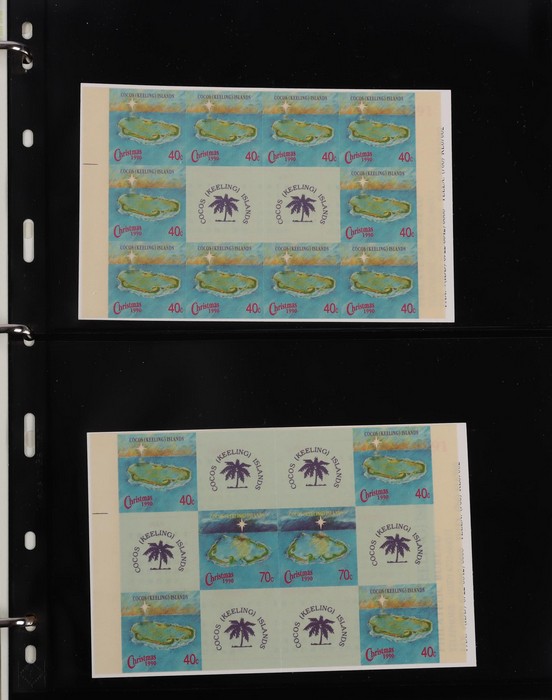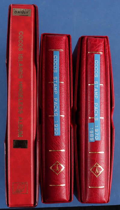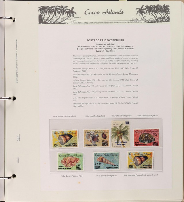 581 imageCocos Island collection 1963-2000 in Seven Seas hingeless & 2 Vario albums with MNH Stamp & PO Pack collection. From 1963 Defs set, then all Pics, Commems & Defs (ex 1990 Air Surch, 1990-91 Surch) inc 1993 Air-Sea Rescue M/Sheet opts 'Taipei 93' M/S (2), 1990 $3 & $4 Christmas bklt (2 ea). Also PO Pack collection 1970-1999 inc 1970 Defs (3, inc with Japanese text) & other Commems & Defs, largely VF. High face value, retail $1400+. (360, 55 packs, M/S & sheetlets) (Image1) (Image2) (Image3) (Image4) (Image5)