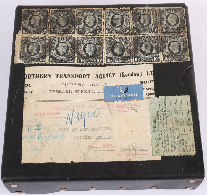 parcel (plastic with leather hinges, 190x190x50mm) sent via 'North Atlantic & Trans-Pacific Air Service' to Department of Information, Melbourne, (22 Oct). Extraordinary franking of KGVI 10/- dark blue (40) & missing a single 5/-, that paid 90 x 4/6