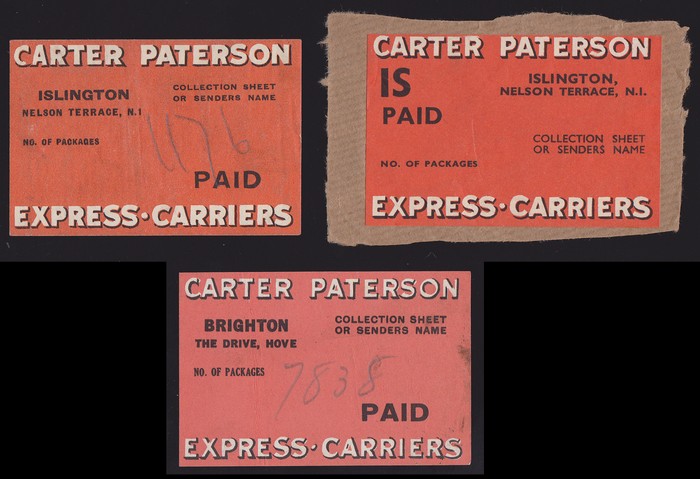 Carter, Paterson & Co Ltd range inc 'Cash On Delivery' label red on buff, 'Paid' label red on white 'Paid' black on pink, 'Islington Paid' black & white on red, 'Islington Nelson Terrace NI' black & white on red, 'Brighton The Drive Paid' both white