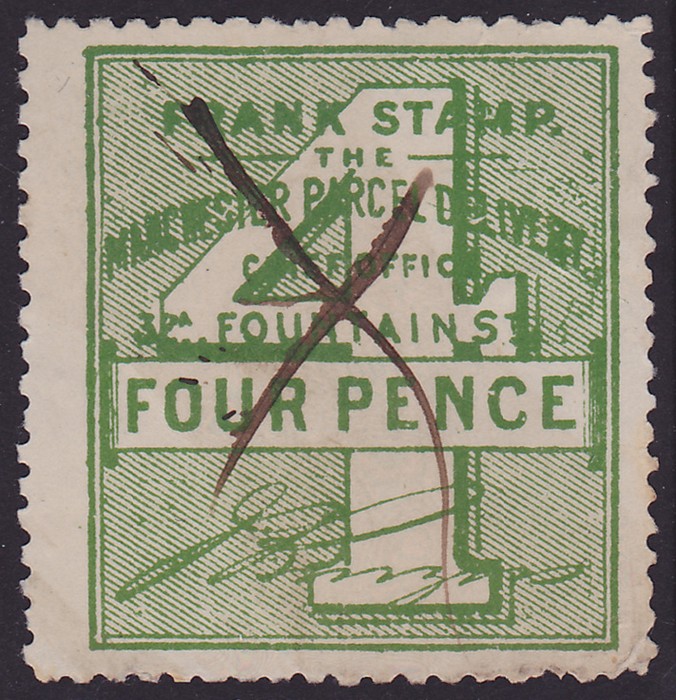 Parcel Delivery ca1890 4d green, Frank stamp, inscribed 'Chief Office 32a Fountain St J Burgess', perf 12. VFU, m/s signature & cross cancels. RL 4. Very rare. (Image1)