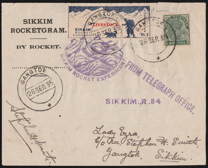 Rocketgram R84 franked KGV 9p & blue rocket label opt Livestock, tied by 'Gangtok 28 SEP 35' cds with mountains cachet. Sl edge tears as usual. Reverse endorsed 'One Cookra' (a cock) & '155 such messages', plus signed Stephen H Smith. (P) (Image1) (Image2)