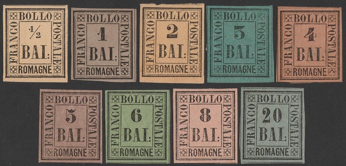 type-set set ½b-20b, plus ½b & 1b listed shades. F-VF U, few imperfections, all barred diamond pmks, 3-4 margins. SG 1-10 cat £20,000+ = A$40,000. Sass 1-9 cat €27,800 = A$46,000. Extremely rare genuine used set. With 5 certs