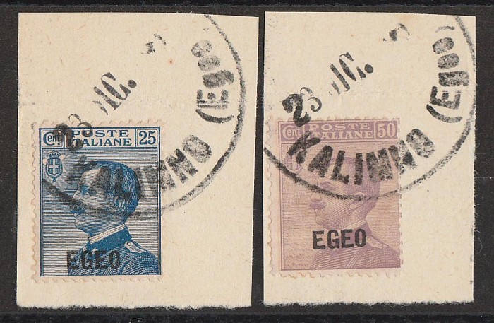 Kalimno: 1912 'EGEO' opt King set 25c blue & 50c violet. VFU, on piece with '23 DIC Kalimno (Egeo)' cds. SG 1-2 cat £88+, Sass 1-2 cat €120+, plus premium for pmks. (2)