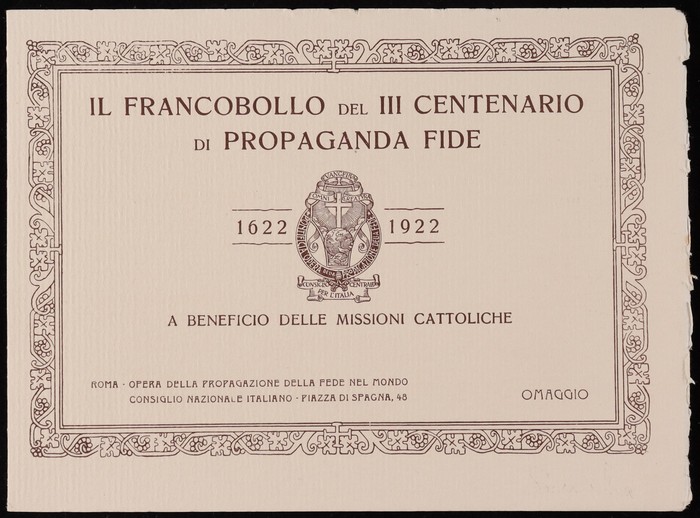 Tercentenary of Congregation set 20c-1L 'Di Propaganda Fide' in special official presentation folder with blks of 9 of ea value attached by top selvedge. Superb fresh MNH. SG 44-47. Sass 45-48 cat €1350+ as loose stamps, plus premium for rare