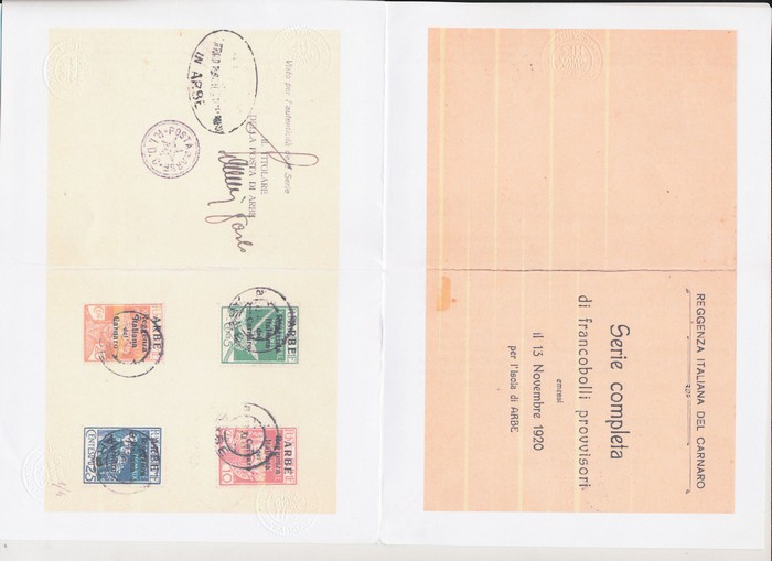 small 'ARBE' opt set 5c-55/5c, plus Express 30/20c & 50/5c (55/5c variety double perf - Sass 10na), tied by '28 XI 20 Arbe'' cds in official PO printed presentation folder with PO cachets & signature. VFU. SG 1b-6 & E7-8 cat £607++, Sass 5-10 &
