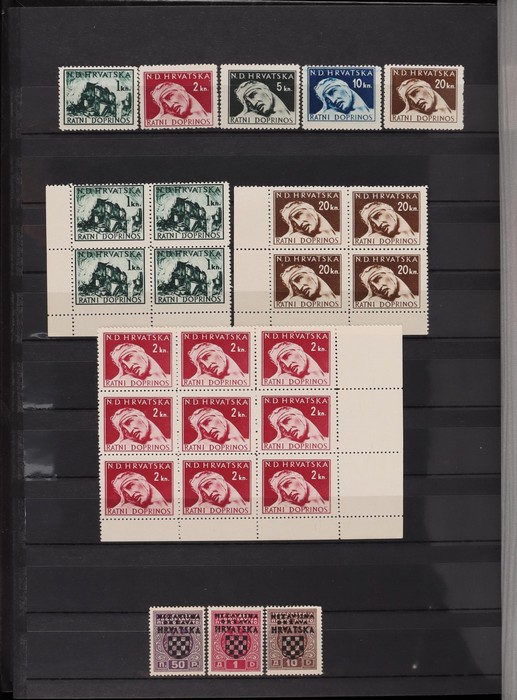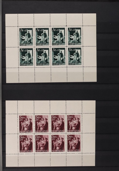 627 imageGerman Occup Croatia: 1941-45 WWII MNH collection in s/book inc 1941 opt Yugoslavia King set to 30D. 1941 Brod Exhib opt set with tabs. 1941-42 Pic set to 100K, plus tete-beche pr to 20k. Also horiz prs, to 10k error imperf vert & 30k vert pr imperf horiz, plus 1.50k imperf pr. 1942 Aviation M/S perf & imperf. 1942 surch 0.25 on 2k tete-beche blk of 4. 1943-44 Castle 3.5k imperf pr, rare unissued essay design. 1943 President 12k + 8k M/S perf & imperf. 1943 Zagreb Exhib 9k, 'S' variety. 1943 opt 18k, offset variety 1943 Legion range of imperf proof colour trials. 1943 700th Anniv, double perfs variety, plus sheetlet. 1943-44 President set to 1010k - 1944 Postal set sheetlets. 1945 Storm Division set with initials OA at base (reprints), 1945 Feldpost opt Military stamp (rare unissued). 1945 Postal Employees set, sheetlets, plus 50+25 sheetlet with' white dot obliterates, plus sign' variety. Mostly VF fresh MNH. Mi cat €3200+ = A$5300+. Unusually nice quality collection. (550 + 21 M/S or sheetlets). (Image1) (Image2) (Image3) (Image4) (Image5) (Image6) (Image7) (Image8) (Image9) (Image10) (Image11) (Image12) (Image13) (Image14) (Image15) (Image16) (Image17) (Image18) (Image19) (Image20) (Image21) (Image22) (Image23) (Image24) (Image25) (Image26) (Image27) (Image28) (Image29)