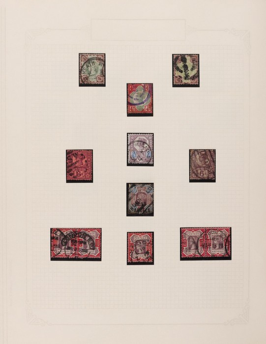 639 imageGreat Britain: 1840-1990 collection in loose leaf album with 1840 QV 1d black. 1841 QV imperfs 1d brown & 2d blue (2). 1855 QV 6d lilac. 1862 QV 1/- green. 1870s QV 3d, 5d (2) & 1/- pmk C of Constantinople (cat £360), plus 4d vermilion plate 14 pmk C51 of St Thomas (Danish West Indies, cat £110). 1873 QV 1/- green wmk Spray of Rose FU (SG 150 cat £150). 1880s QV opts 3d/3d & 6d/6d lilac (cat £300). 1883 QV high vals 2/6, 5/- (2, inc Private perfins) & 10/-. 1887 QV Sidefaces to 1/- inc 6d & 9d opt 'Govt Parcels' 1902-10 KEVII set to 10/-. 1934 KGV Seahorse set 2/6, 5/-, 10/- (cat £190). 1939 KGVI set of 6 to £1 brown. 1948 KGVI Silver Wedding £1. Comprehensive QEII pre-dec inc Castles to £1. Wide range of 1970s-80s-90s Pics/Commems. Some mixed condition, many G-F/VFU. High cat value. (Few 100) (Image1) (Image2) (Image3) (Image4) (Image5) (Image6) (Image7) (Image8)