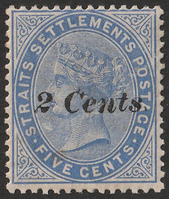 opt QV 8c/12c dull purple with '8 Cents' in BLUE instead of black. VF UN with excellent colour. Scott 68 cat US$11,000. SG 80b cat £11,000. Very rare genuine as only 1 pane of 60 printed & very few have survived. 1939 RPSL photo-cert while diff
