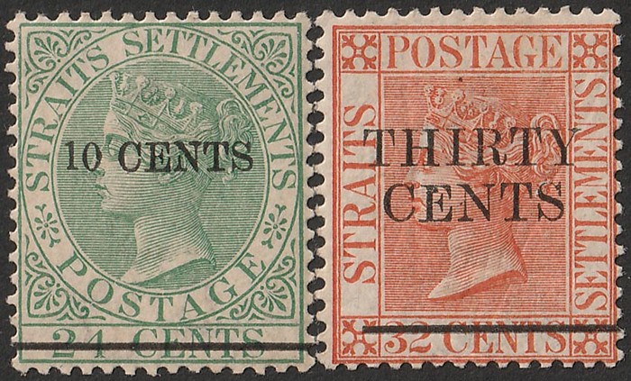 '10 CENTS' on 24c green & 'THIRTY CENTS' on 32c orange-vermilion. VF MLH. Scott 75 & 76 cat US$25. SG 86 & 87 cat £36. (2) (Image1)