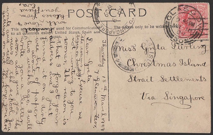 Christmas Island PPC franked GB KEVII 1d red, tied by 'Glasgow MR 18 09' cds. To Miss Greta Darling with part 'Penang to Singapore AP 9 1909' & 'Christmas Island 2 MY 1909' cds. Rare early usage during Straits Settlements admin period. (P) (Image1) (Image2)