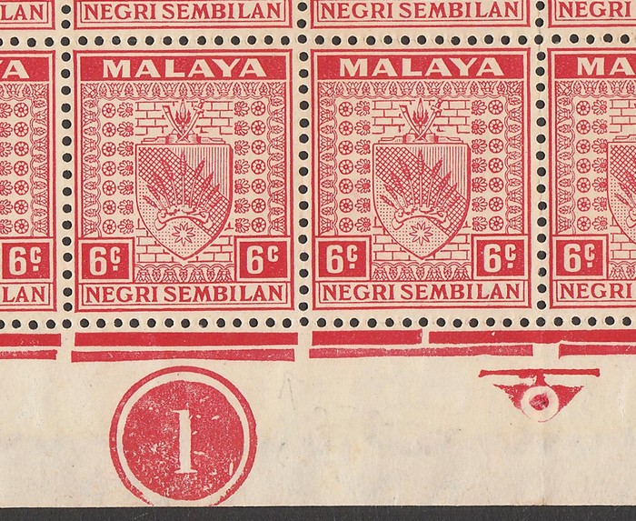 1935-41 Arms 6c scarlet, lower half of sheet, with Plate No 1, inc major variety 'stop omitted at right' (R10/4). VF MNH. SG 27/27a cat £1782+ as singles, plus premium for positional se-tenant part sheet which should be +50%, so est cat