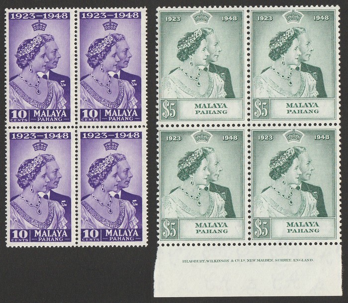 Silver Wedding set 10c & $5 with $5 in Bradbury Wilkinson imprint blk of 4, while 10c normal blk of 4 (as imprints do not exist on 10c). Superb fresh MNH. SG 1& 2(var) cat £162 as singles & should be at least double, £324++ for rare