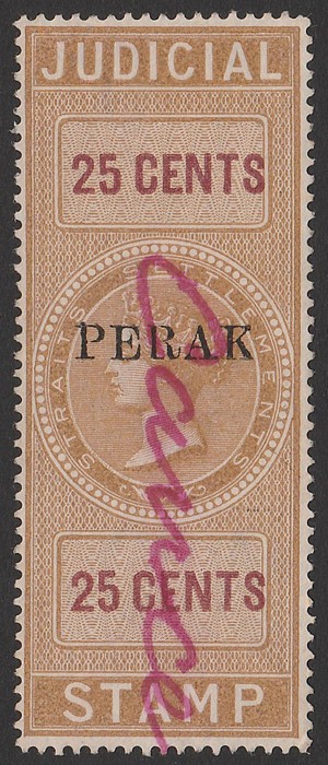 'PERAK' opt QV Judicial 25c brown & purple, seriffed, opt 15x3mm with curved tail to 'R'. VF F/C, red m/s 'cancelled'. Bft 6. (Image1)