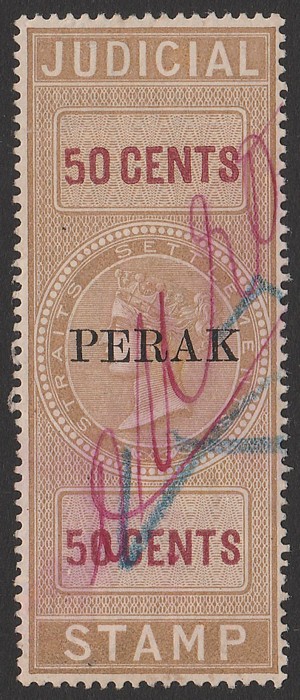 'PERAK' opt QV Judicial 50c brown & purple, seriffed, opt 15 x 3mm with curved tail to 'R'. VF F/C, m/s initials. Bft 7. (Image1)