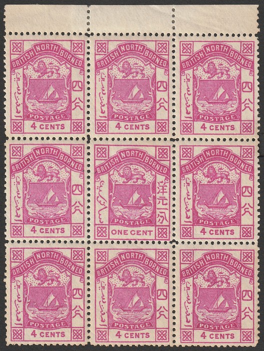 inscribed 'POSTAGE' top marginal blk of 9, centre stamp error 'ONE CENT' instead of '4 CENTS' Stamp superb MNH, nice colour & excellent centring. SG 26/26d cat £410 for M singles, should be at least double, £820 MNH, plus premium for