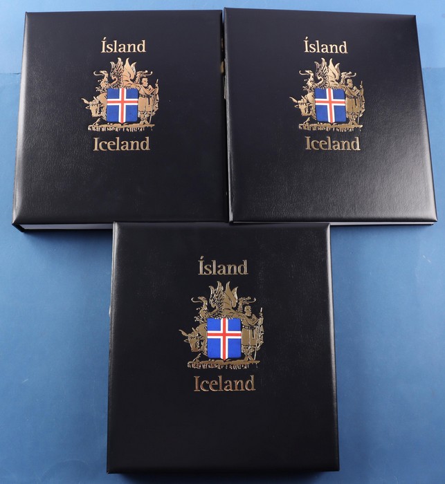 667 imageIceland: 1873-2018 extensive & valuable M/MNH collection in 3 Davo hingeless albums. Noted 1873 8Sk brown, 1876 6a grey, 40a green M, 1882-96 3a orange, 20a grey-blue, 40a brown-lilac perf 14x13½, 50a red & blue, 100a purple & bistre M, 1914 5a green SG 112 M, 1920 King Defs inc 1920 50a claret & grey, 10a chocolate M (toned), 1921-30 Surch inc 30a on 50a, 50a on 5K, 2K on 25a, 10K on 5K, 1925 Pics to 35a M, 1930 Millenary part set, 1931-32 Waterfalls (ex 20a), 1934 Air set, 1947 Air (ex 75a), 1935 1Kr Mt Hekla, 1937 Jubilee M/sheet, 1940 World Fair set, 1938 Geyser set M, 1935 Pics 10a green Cod, 25a Scarlet Cod MNH, 1948 Volcano Pics M, 1950 Pics (SG 296/308), 1954 First Native Minister, 1956 Power Pylon sets M/MLH. Then a comprehensive collection through to 2018 inc some booklets, few others inc 2012 & 2013 Year Books. Colourful Theatrics, some earlies mixed condition but attractive collection largely F/VF. SG £10,200+ = A$21,000, plus high cost of the albums. (c1000, 10+ M/sheets, 10+ booklets) (P) (Image1) (Image2) (Image3) (Image4) (Image5) (Image6) (Image7) (Image8) (Image9) (Image10) (Image11) (Image12) (Image13) (Image14) (Image15)