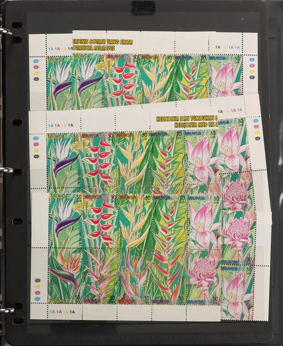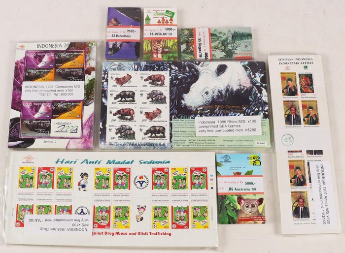672 imageIndonesia: 1996 Rhino M/Sheet (100) all with 'SEA Games Oktober 1997 opts (SG 2267a(var), est. cat £650), 1997 Cultural Anniversaries M/Sheet (100), SG 2308(var) £1050, 1998 Anti-Drug sheetlet (100), SG 2415a(var) £1120, 1998 Juvalex & Singpex M/S (100 of ea, £825), 1998 Gemstones M/S pr (100, SG 2405(var), £660), Australia 99 M/S (100, £325). All fresh MNH in bundles of 100. FV $550 alone. Zonnebloem cat €3280 = A$5250. Total SG cat £4650 = A$8300. (800) (Image1)