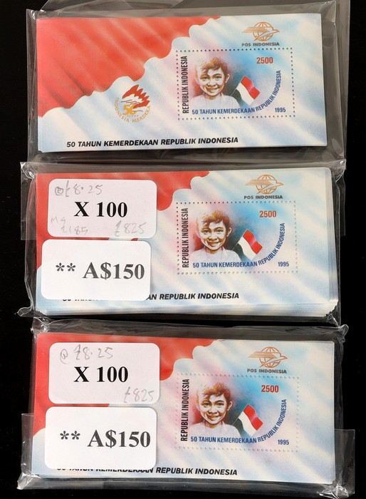 673 imageIndonesia: 1997 Cultural Anniversaries M/S with 3 sets & label (100, SG 2310var cat £1050), 1996 Sports Week M/S pr (SG MS2666, £650), 1996 Rhino M/S with 2 sets of 4 (SG 2270var £650), 1998 Anti-Drug sheetlet with 8 Tete-Beche prs (SG 2415var, £1120), 1998 Minerals set of 2 M/S (100 sets, SG 2403/06, £660). 1998 Juvalux & Singpex M/S (100 of ea, £825), 1999 Australia 99 Exhib M/S (100, £350). All fresh MNH in neat bundles of 100, FV A$450 alone. Total SG £5300 = A$10,600. Zonnebloem €4000 = A$6650. (1000 M/S) (Image1)