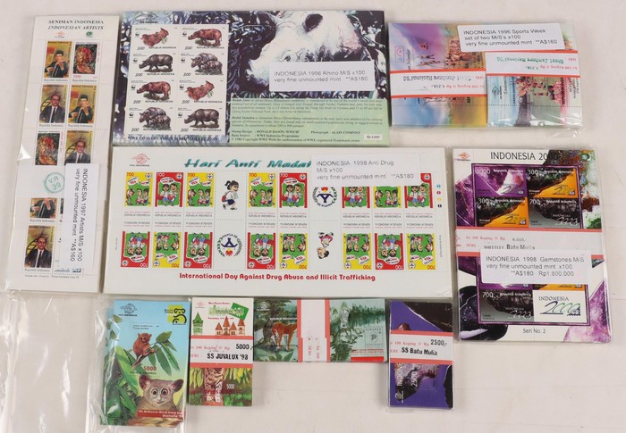 674 imageIndonesia: 1997 Minerals M/Sheet of 9, plus label (SG 2312(var) cat £1050), 1996 Rhino M/S of 8 stamps (100), SG 2267a £650, 1996 Sports Week M/S set of 2 with Istanbul 96 opts (SG MS2266, £650), 1998 Anti-Drug sheetlet of 8 Tete-Beche prs (SG 2415a, £1120), 1998 Juvalex & Singpex M/S (100 of ea, £825). 1999 'Australia 99' 5000Rp M/S (100, £350). Fresh MNH in neat bundles of 100. Total SG £4645 = A$8400. Zonnebloem €3560 = A$5900. (800) (Image1)
