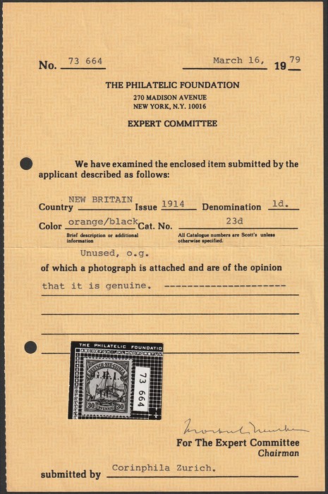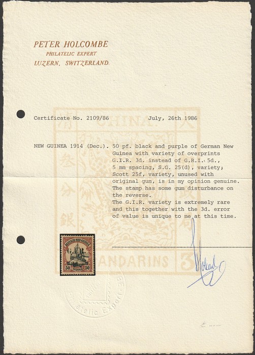 among the GRI issue, we consider them of far greater philatelic importance than inverted or double opts. Great rarity with only several recorded. Exp twice inc Kosack, plus 1979 PF NY photo-cert, while new AIEP certificate can be obtained on request.