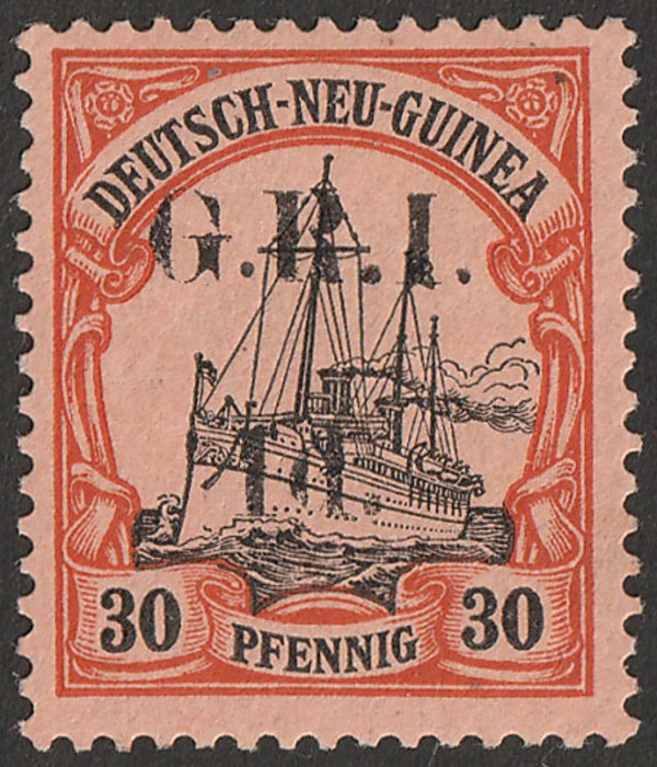 6mm opt DNG Yacht 30pf black & orange, variety 'opt shift up' with GRI at top of stamps over the German inscription. VF fresh MLH. Scott 8 cat US$475+. SG 8 cat £475. Exp Bothe BPP. (P) (Image1)