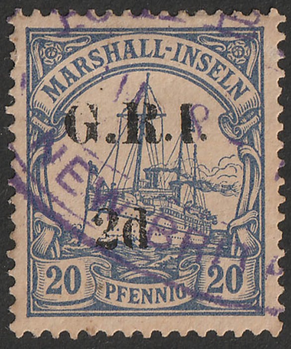 opt Marshalls Yacht 20pf blue, variety 'no stop after d'. VFU, part Rabaul oval cancel. Scott 33a cat US$150. SG 53e cat £120. (P) (Image1)