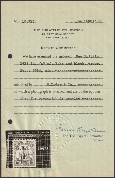 among the GRI issue, we consider them of far greater philatelic importance than inverted or double opts. Great rarity with only several recorded. Exp, plus 1959 PF NY photo-cert, while new AIEP certificate can be obtained on request. (P) (Image1) (Image2)