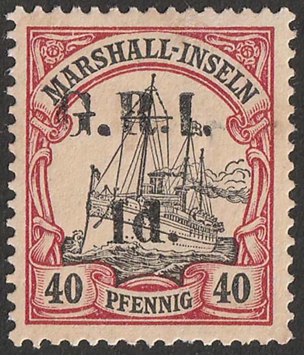 1d.' 5mm opt Marshalls Yacht 40pf black & carmine, opt ERROR OF VALUE of '1d instead of 4d'. Superb fresh MLH, with nice original gum & bright colours. Scott 37g. SG 56j cat £17,000 & undercatalogued. As there are only very few errors of value