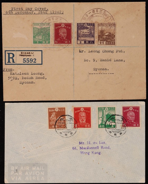 689 imageJapan Occupations & Wars: 1894-1945. Singapore 1942 (Dec 8) Registered FDC with Japan Pic vals to 25S. Hong Kong Local Airmail cover. Range of stamps inc 1894 War in China 2S & 5S, Occupation of Philippines, Manchukuo Empire selection, plus Malaya Occupation oddments. Also 3 banknotes 10S & 50S (2) denominations. Most G-VF M/U. (36 stamps, 2 covers & 3 banknotes) (Image1) (Image2) (Image3) (Image4)