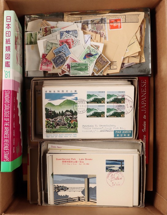 690 imageJapan 1957-70s cover collection sorted by years in 12 cigar boxes, small boxes & packets. Mainly FDCs, some Postcards & FFCs. Appears fairly comprehensive but not cheeked. Some loose stamps in boxes. Also several Japanese publications inc index to Japanese philately, mail of Japan (1951), catalogue of Japanese stamps etc. F-VF FDCs. Interesting collection. (350+ FDCs) (Image1) (Image2)