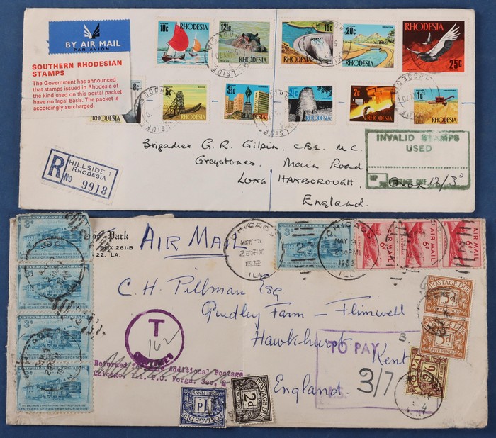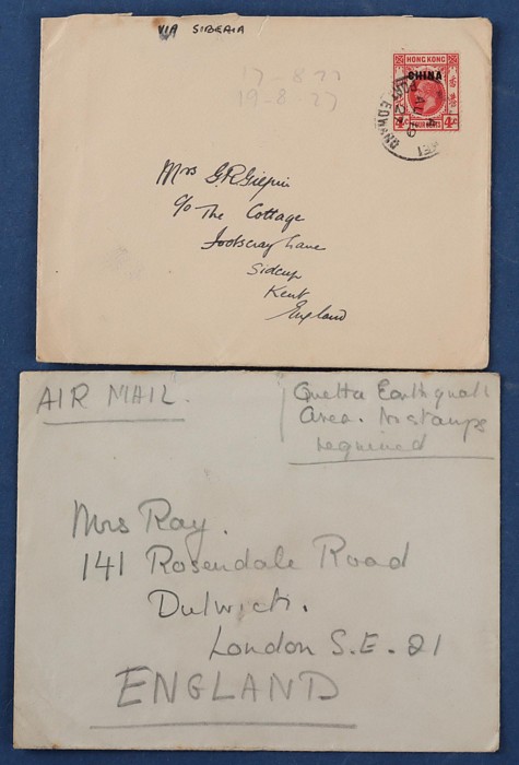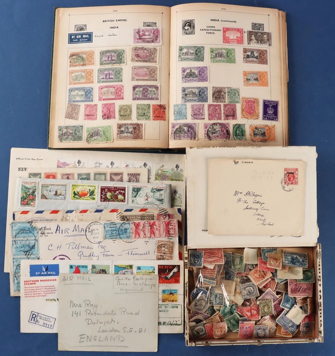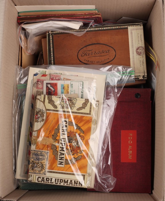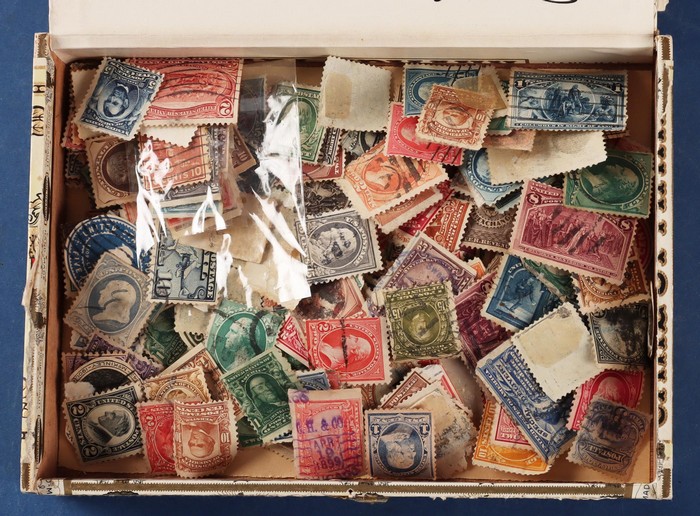 704 imageMess in large carton. World lot 1880s-1970s, 2 old album collections to 1930s inc GB Seahorses to 10/-, Hong Kong KGV to $1 M, Ceylon KGV to 1R M, other pickings, various on paper, on covers, in cigar boxes & loose in plastic bags noted Germany, Austria, USA inc 1898 Trans-Mississippi, France, British Commonwealth covers, 1935 Quetta Earthquake 'Free' inc 1952 USA Air to UK, charged 3/7 Duty, 1935 USA Airmail to India with Karachi Flight cancelled, 1927 Hong Kong KGV 4c opt China to UK via Siberia, St Helena 1968 FDC set to £1 (2) etc. Rhodesia 1966 to UK with 'postage due' as still not valid for postage. Interesting lot with many 1910-30s period only briefly reviewed & could be finds. Mainly GU-VFU, some F-VF MLH/MNH. (1000s & 200+ covers) (Image1) (Image2) (Image3) (Image4) (Image5) (Image6) (Image7) (Image8) (Image9) (Image10) (Image11) (Image12) (Image13) (Image14) (Image15) (Image16)