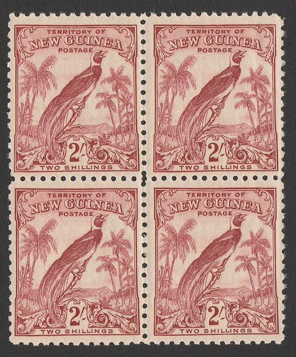 Bird 2/- dull lake, blk of 4. VF fresh MNH. SG 186 cat £32 for M singles, should be at least double, £64 MNH, plus premium for blk. (Image1)