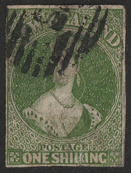 1/- deep green, imperf, no wmk, on Pelure paper. FU appearance, expertly repaired LR cnr, 4 margins, barred pmk. CP A6f(2) cat NZ$2500. Scott 25. SG 86 cat £1200. (P)