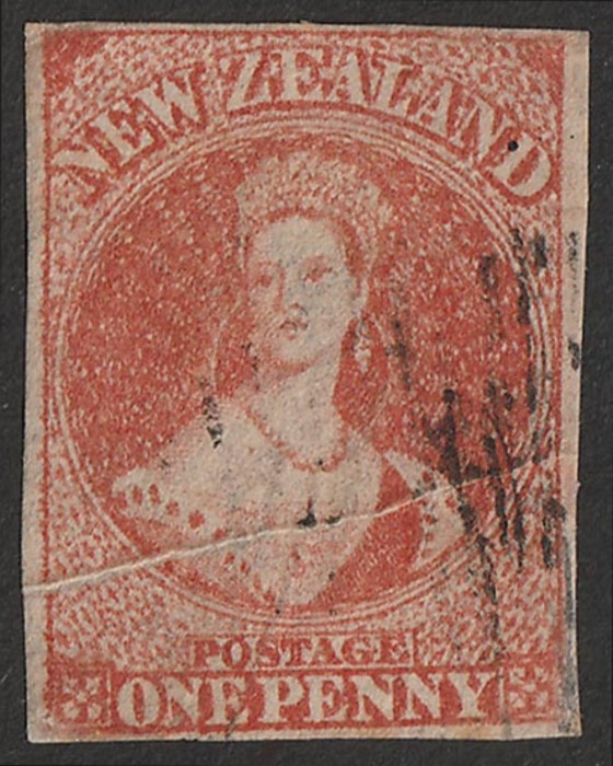 1d vermilion, imperf, wmk Large Star, variety pre-printing paper fold. VFU appearance with 4 margins but expertly repaired lower cnrs, barred pmk. CP A1e(3)(var) cat NZ$800+. Scott 11e(var). SG 34(var) cat £350+. (Image1)