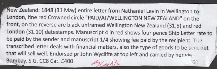 with crowned circle 'PAID AT WELLINGTON, NEW ZEALAND' in red, rated 4d paid by sender, & 1/4 recipient to pay. With transcript. To London per John Wycliffe, via Southampton. SG CC8 cat £400. (P) (Image1) (Image2)