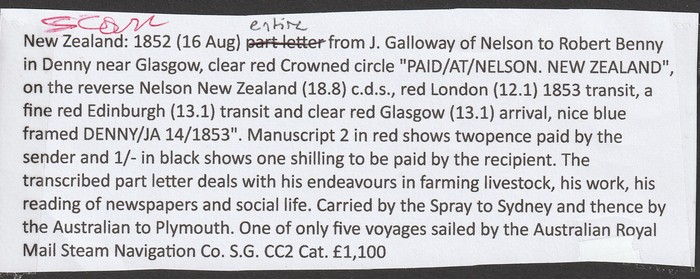 with crowned circle 'PAID AT NELSON, NEW ZEALAND' settlers letter with interesting contents New Zealand' To Glasgow with b/s of Nelson, Glasgow, & 3 others. SG CC2 cat £1100. (P) (Image1) (Image2)