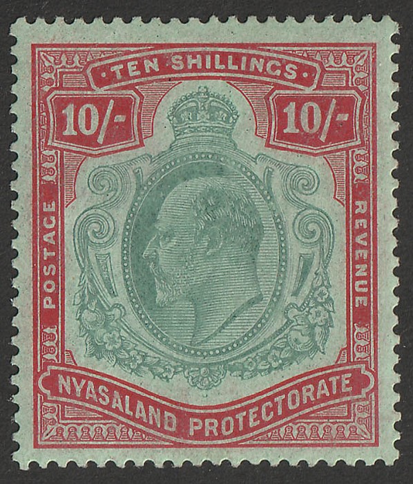 £10 purple & royal blue. Superb MNH, bottom marginal, with never hinged original gum that has insignificant areas of aging but still unusually fresh, excellent centring & deep colours. Scott 24 cat US$4500 for M. SG 99e cat £4500 for M,