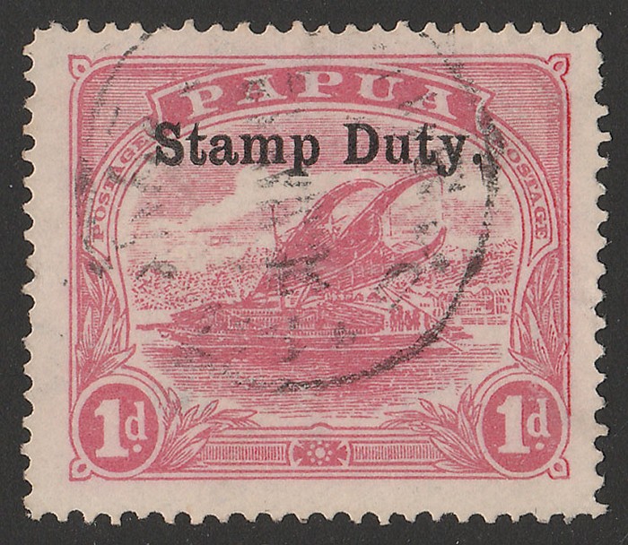 Duty' curved opt Lakatoi Large Papua 1d black & red (SG 76). VFU, 'Samarai 24 SEP 12'? cds. Bft 11 cat £35 for F/C. SG F1(var) cat £80 for mono-colour. Rare. (P)