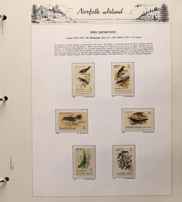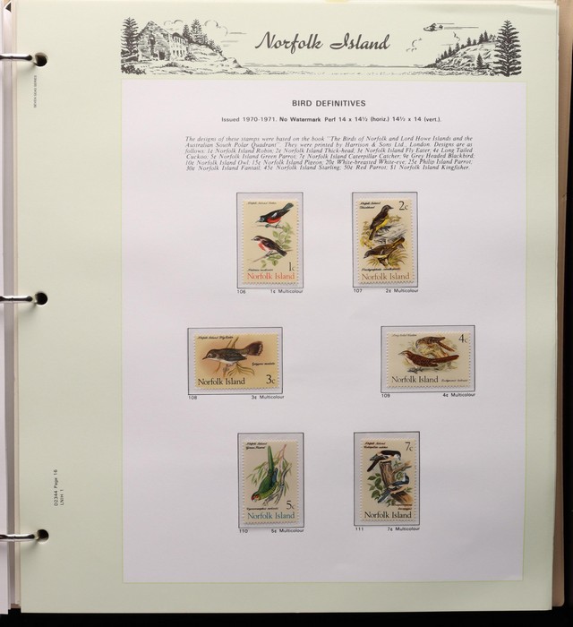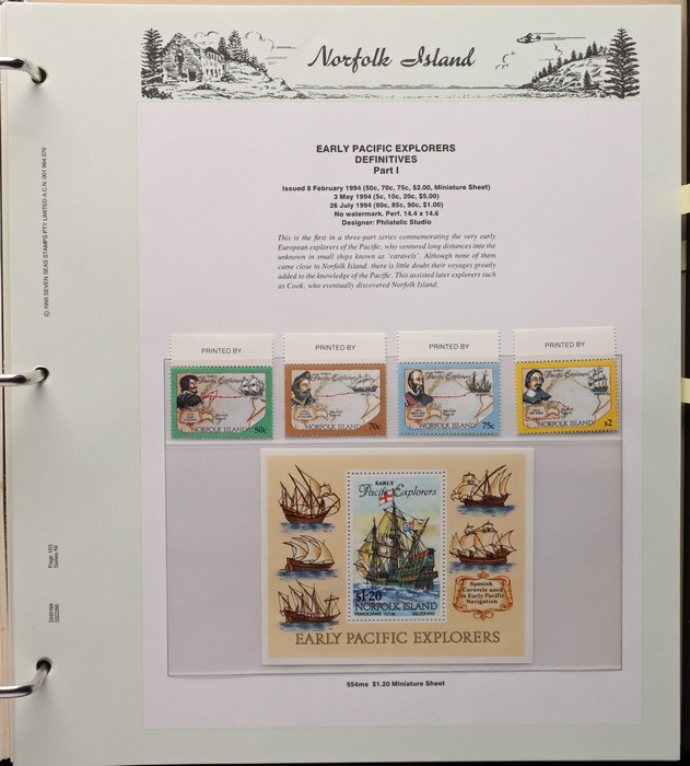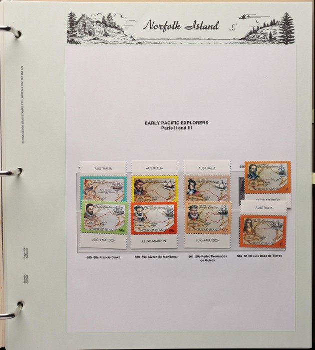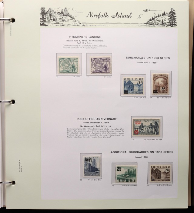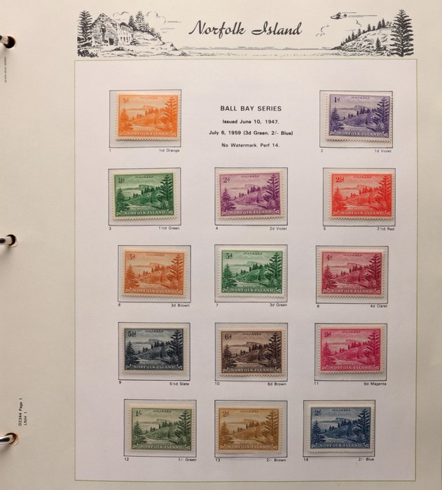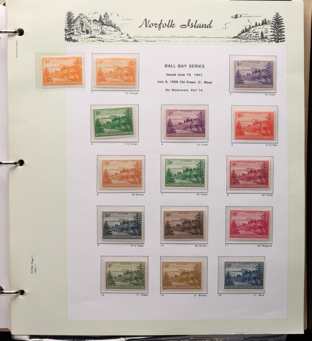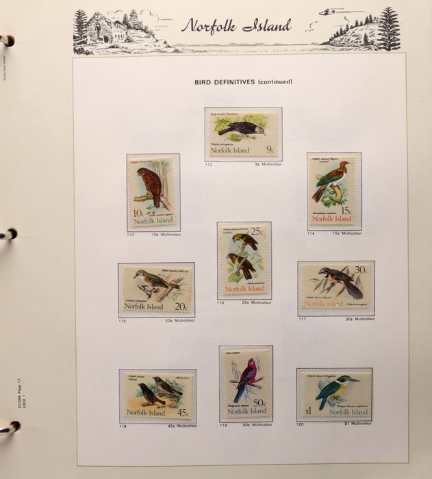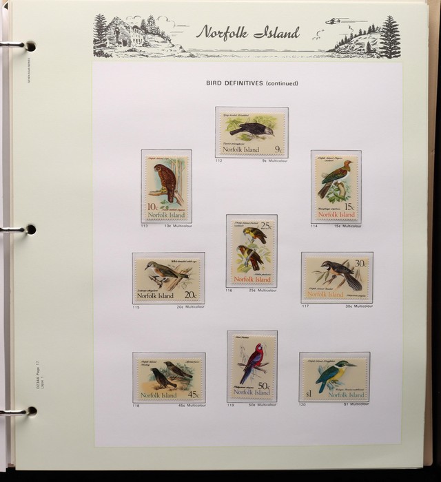 732 imageNorfolk Island: 1947-1994 virtually comp MNH collection in KA-BE hingeless album with 1947 Ball Bay set to 2/- blue plus ½d, 1d, 1½d, 2d white papers, 1958-60 Surcharges set of 5, 1960 Defs to 10/- Bird plus extra 10/- opt SPECIMEN at UL (retail $110) & all other pre-dec Pic/Commem sets & singles. 1966 opt set, 1967 Ships & 1969 Bird sets, 1974 UPU M/Sheet, 1980 Aircraft, 1984 Flowers, 1987 Scenes, 1990-91 Ships, 1994 Explorers sets all to $5 plus nearly all the other decimal Pic sets & some extras inc 1969 Birds pack, 1987 Scenes pack & 6 diff 1990s booklets. All fresh MNH, retail $1200 plus extra for the hingeless album. (Image1) (Image2) (Image3) (Image4) (Image5) (Image6) (Image7) (Image8) (Image9) (Image10) (Image11) (Image12) (Image13) (Image14) (Image15) (Image16)