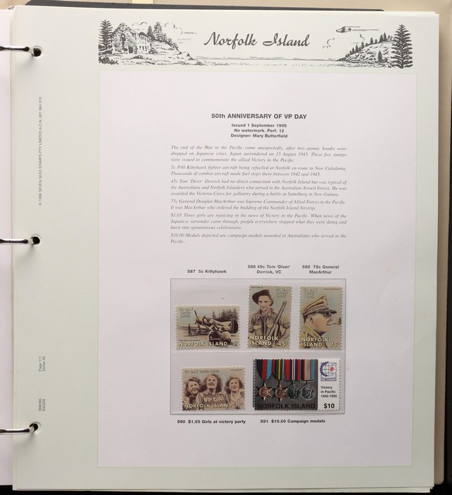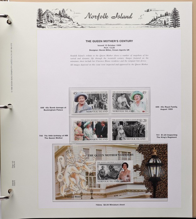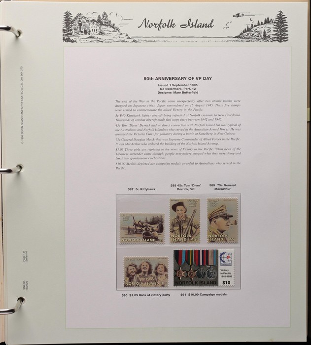 733 imageNorfolk Island: 1947-1999 comprehensive MNH collection in 2 Seven Seas slipcase hingeless album (new retail $300) inc 1947 Ball Bay to 2/- blue, 1953 Defs to 5/- brown Bridge, 1958-60 Surcharges set of 5, 1960 Defs to 10/- Bird, 1960 Local Govt 2/8, 1966 opt set, 1967 Ships, 1969 Bird sets, 1974 UPU M/Sheet & 1980s-90s long Pic sets to $5, plus most other decimal MNH sets. Retail $1200, plus another $300 for the album, total $1500. (Image1) (Image2) (Image3) (Image4) (Image5) (Image6) (Image7) (Image8) (Image9) (Image10) (Image11) (Image12) (Image13) (Image14) (Image15) (Image16)